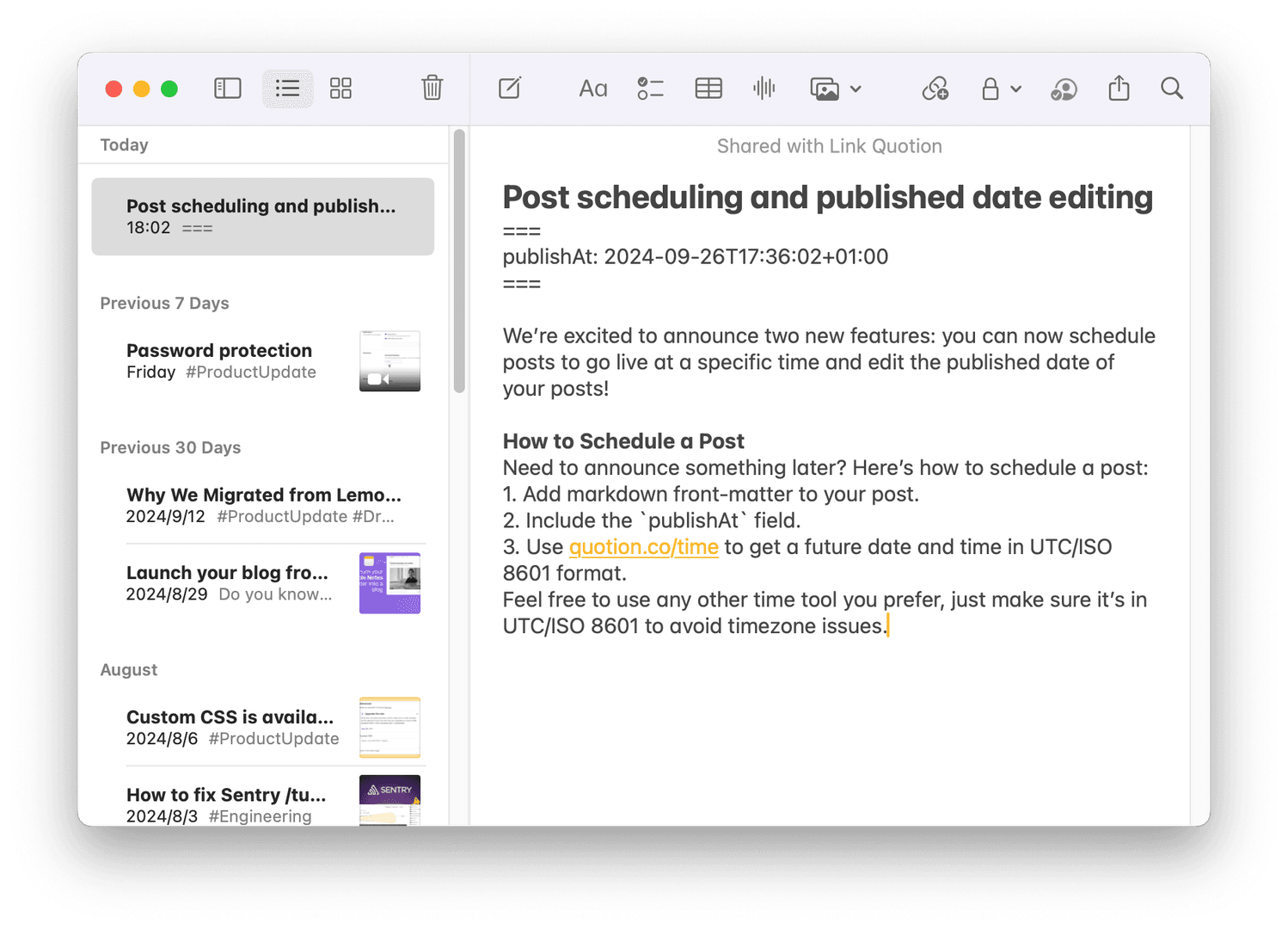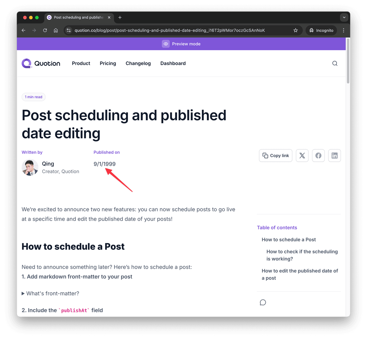 Previously, Quotion used the created or updated date as the published date of a post. Sometimes, you may want to customize the date. Here is how to edit the published date: